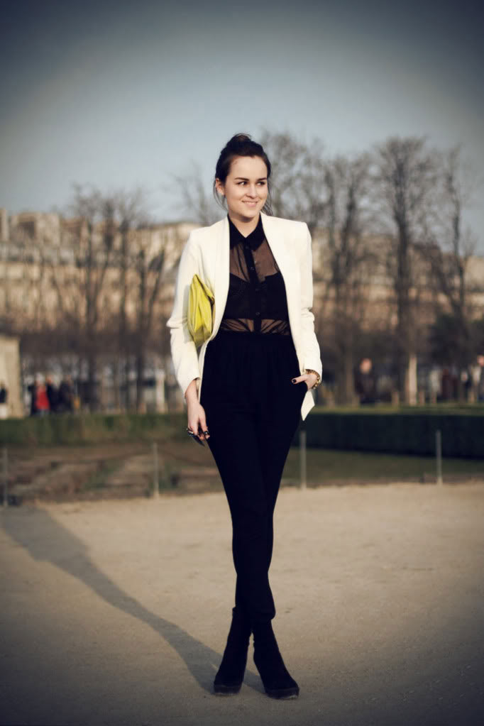 i love the simplicity and effortless of this look ! i love the structered bra top underneath that sheer top, i also love that white blazerhttp://myheadandwardrobe.blogspot.com/