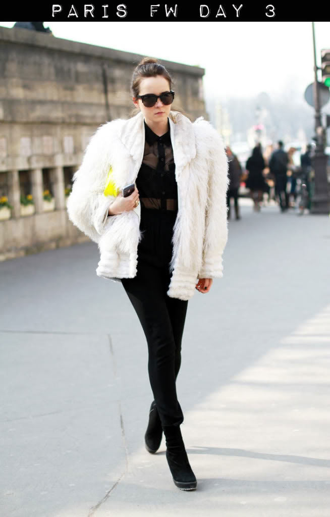 Wow, nice combo, nice outfit with the white fur jacket and everything. Looks really great. :) I also like your translucent black top, sexy. :)