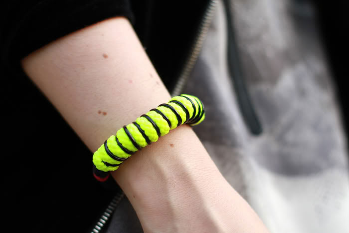 I really love how you've added fluorescent bracelets to a darker outfit!
