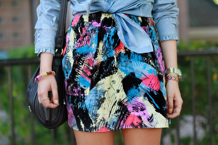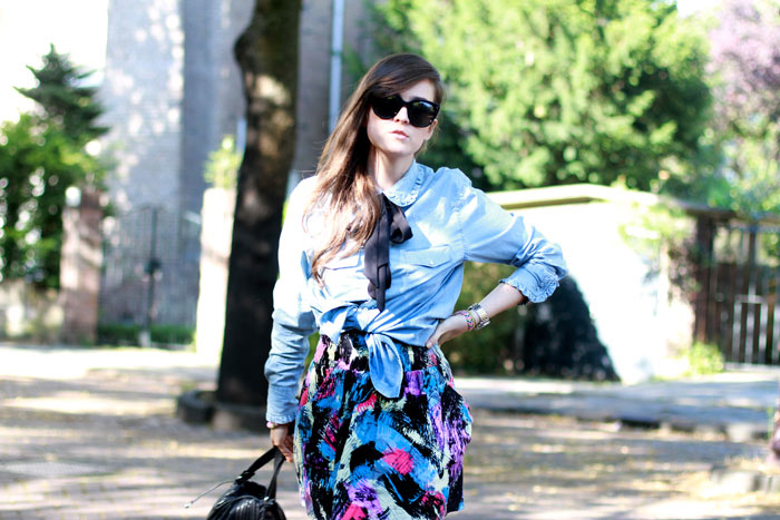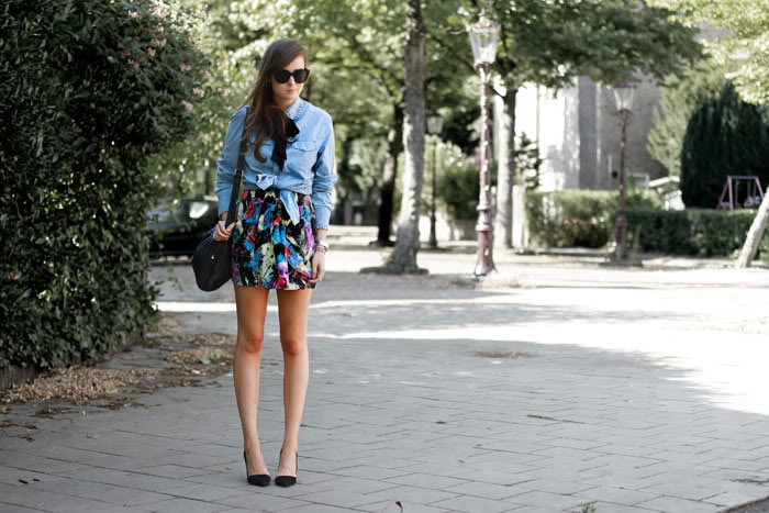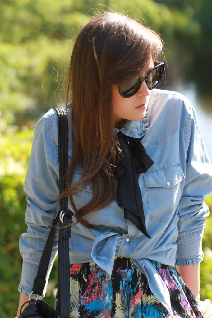 I really like your outfit. The print of the skirt pops out even more even you pair it with the denim shirt. The bow-tie like detail is cute. Happy Monday to you Andy :)