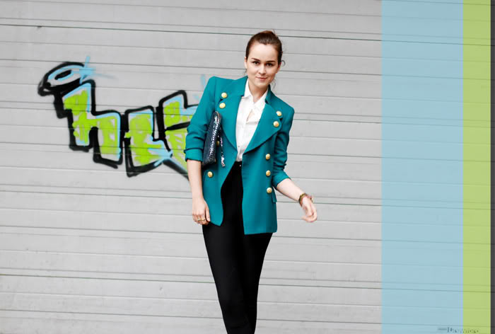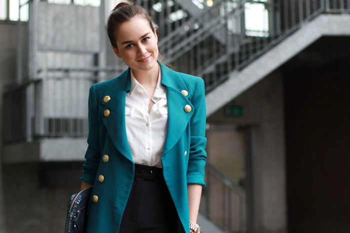 This green is one of my favourite colours… it looks awesome on the jacket with the golden buttons… XoXohttp://www.chezagnes.blogspot.com