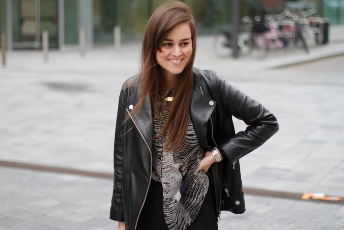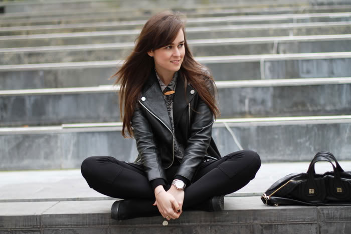 i always love the combination of softer pieces, like this flowy blouse, with harsher ones, like the leather jacket ^^looks great on you!!! :)and that necklace is one of my favourites from yours!
