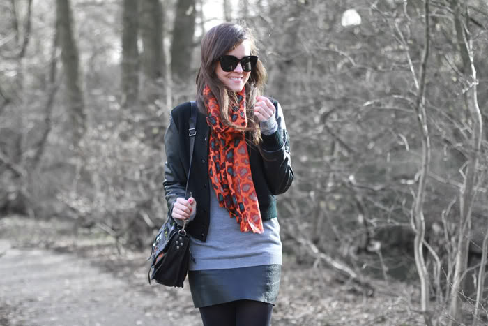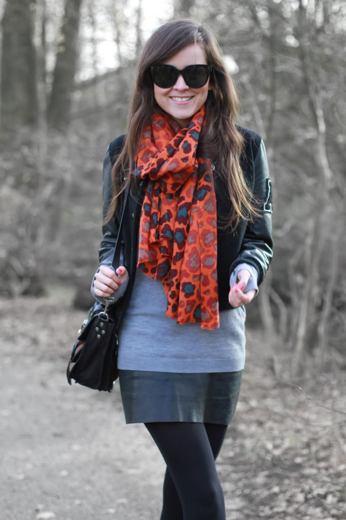 Very nice outfit!! I like your scarf and the leather skirt is amazing!