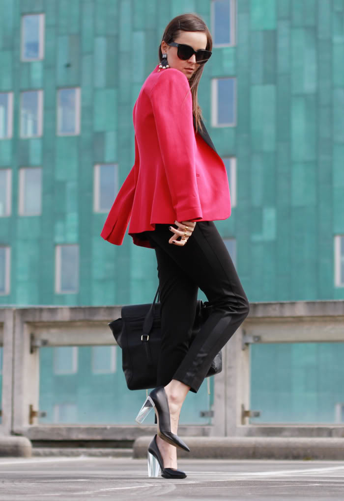 I love how all your pieces are quite basic, but always with a twist. The leather panel on your pants, the transparent heels, the contrasting collar of the blazer, I love it! I need to learn to shop carefully like you, I often buy simple pieces that easily becomes "boring", but now I realise I need them to be basic pieces with some twists!Nora Nora Finds
