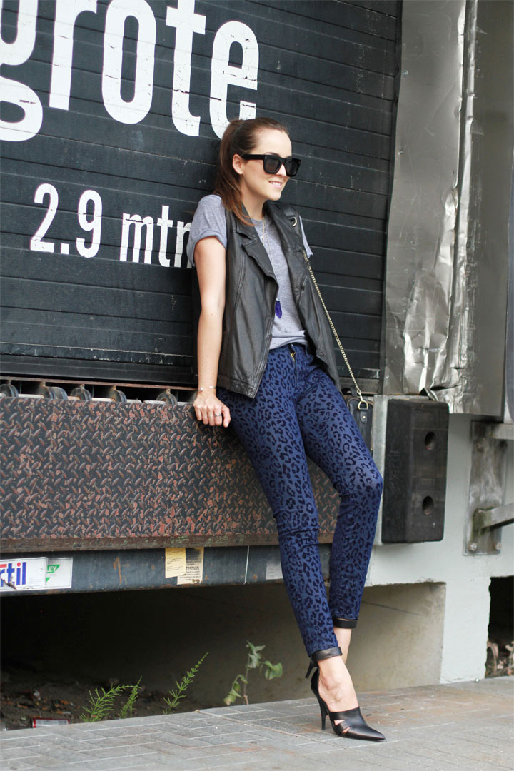 Great combination of the leopard jeans and the leather vest!www.laceandpearlsbyroos.com
