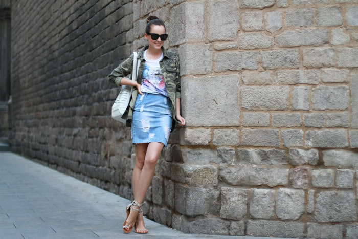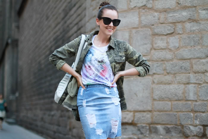 Love the combo military jacket and distressed skirt ! Perfect !