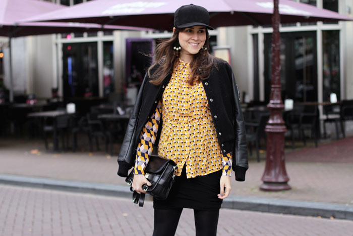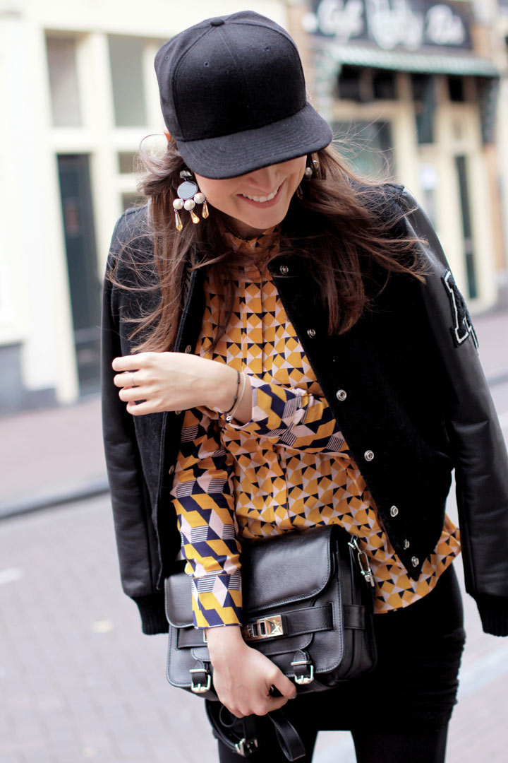 Printed blouse: H&M Trend / Boots: ACNE / Skirt: T by Alexander Wang / Bag: Proenza Schouler / Jacket: American College / Earrings: H&M