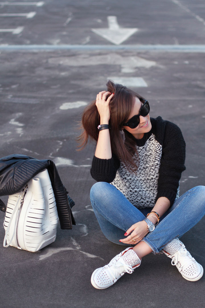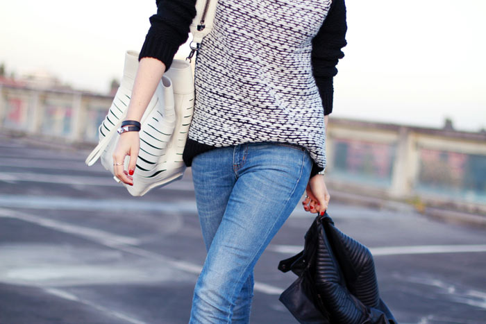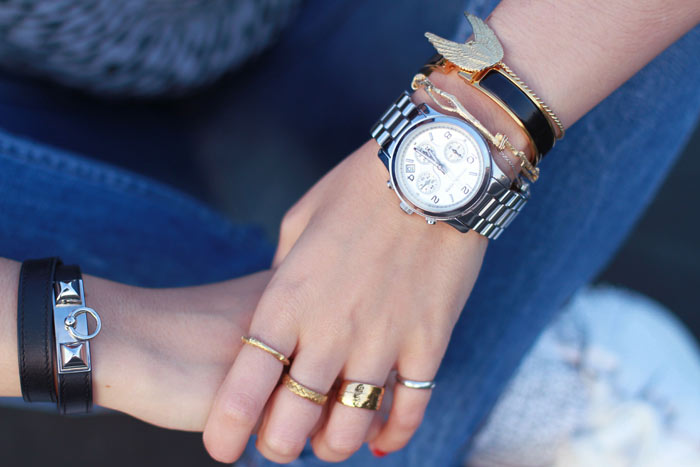 Sweater: MANGO  |  Shoes: Sandro (c/o)  |  Jeans: Monki  |  Bag: Alexander Wang  |  Earrings: H&M  |  Branches gold bracelet: Linda Friedrich (c/o Boticca)  |  Black bracelets: Hermes  |  Wings bracelet: Flashy Era c/o Boticca  |  Leather jacket: ZARA