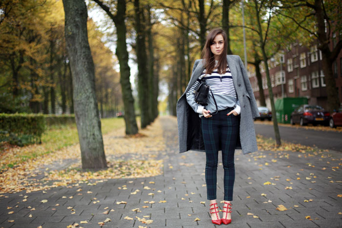 The color of the trees during the Autumn is really a feast for the eyes. Some turn yellow, some turn red and some just don’t want to change at all, which is good since it creates a multicolor effect that works like magic as a photo background ;). Autumn posts are definitely my favorites, because of this very reason -I just hope the trees stay yellow for a little longer than a week! … My outfit today is a bit of a miss match of patterns, but I like that, I like the fact that its a little bit all over the place.