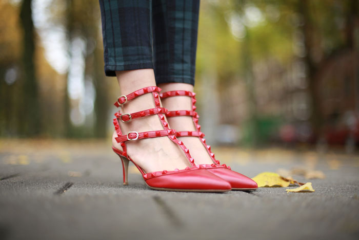 Fashion blogger Andy Torres from StyleScrapbook wearing red Valentino shoes and checkered pants
