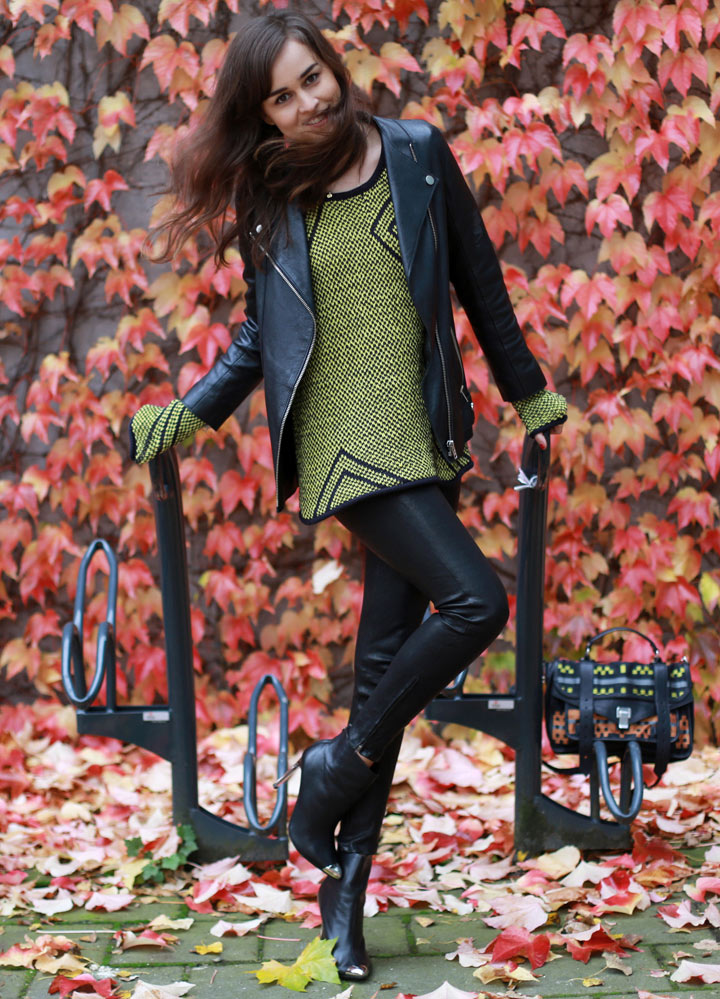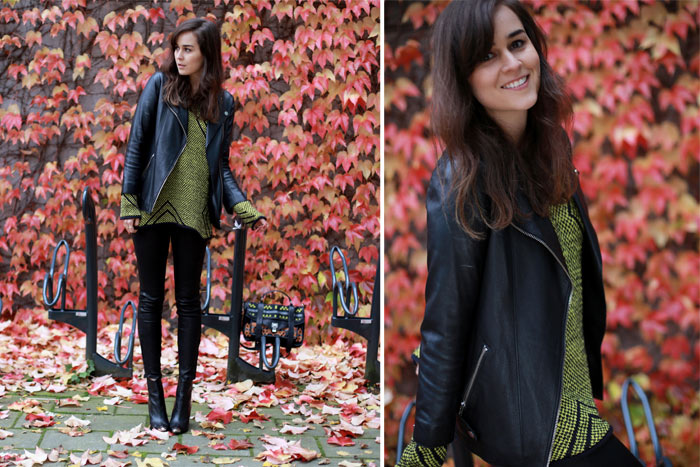 Sweater: Bimba & Lola | Leather pants: J Brand (c/o) | Jacket: H&M Trend | Boots: ZARA | Bag: Proenza Schouler