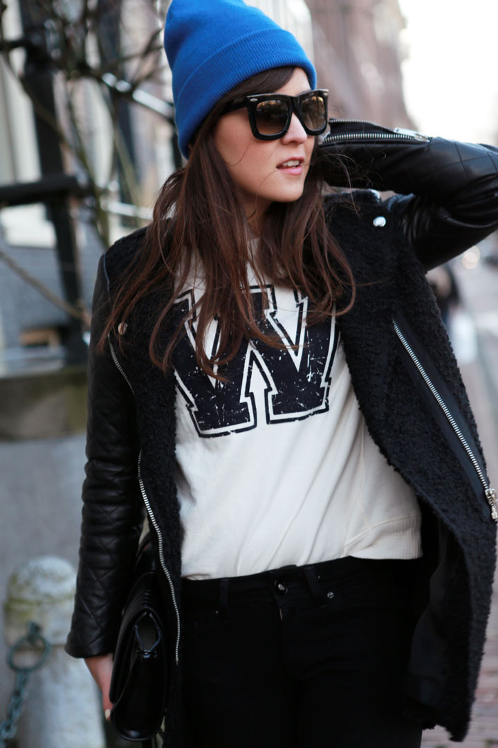 Bought that same sweater last week! But how fun is that pop of blue of your beanie?! Have fun in NY…X Marjolein – Never Too Polished.com