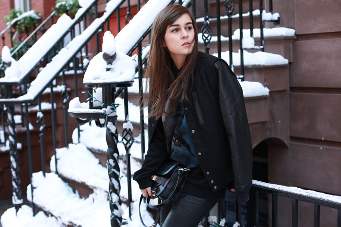Leather pants: J Brand | Boots: ZARA | Jumper: Givenchy | Jacket: Nike SW Destroyer | Bag: Proenza Schouler