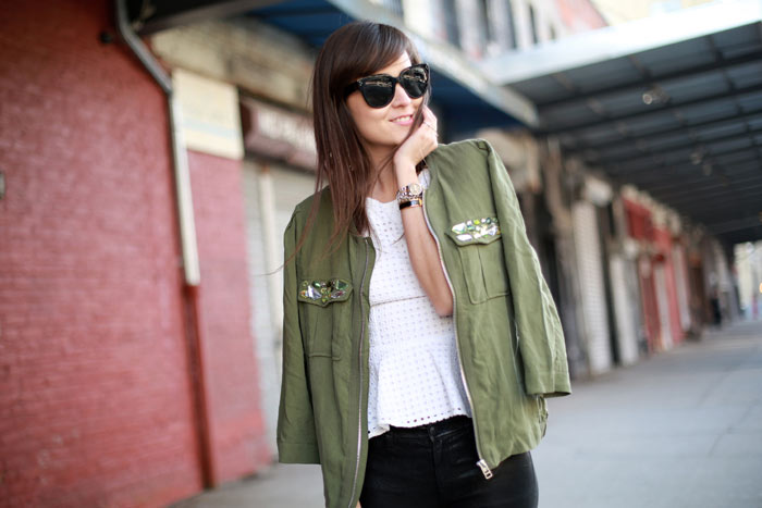 I love the detailing on the jacket pockets! The army green on white is a classic combo, but the crochet/peplum combination makes for an interesting twist.- AshleyNot Haute