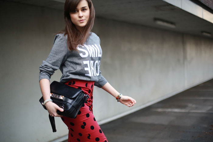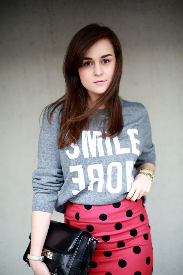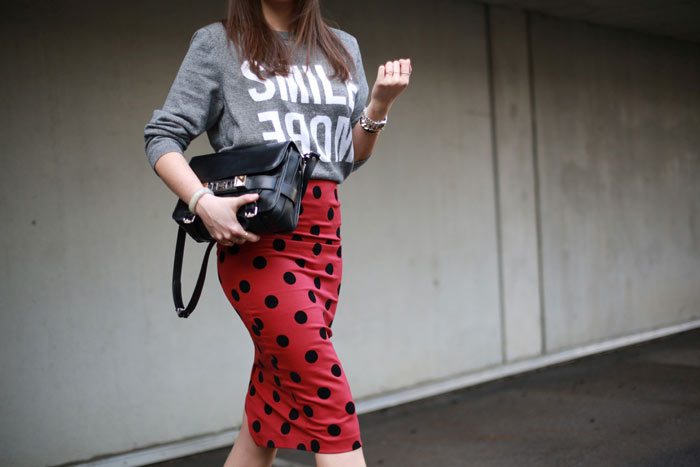 Oh I always love me some polka dots!! And it's awesome how you've dressed up a sweatshirt with a pencil skirt…chic and casual :)Veloria in Velvetwww.veloriainvelvet.wordpress.com