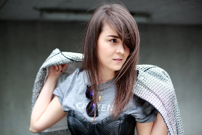 Gorgeous jacket and love the combination of the tee with the bustier! xxwww.creativityandchocolate.com