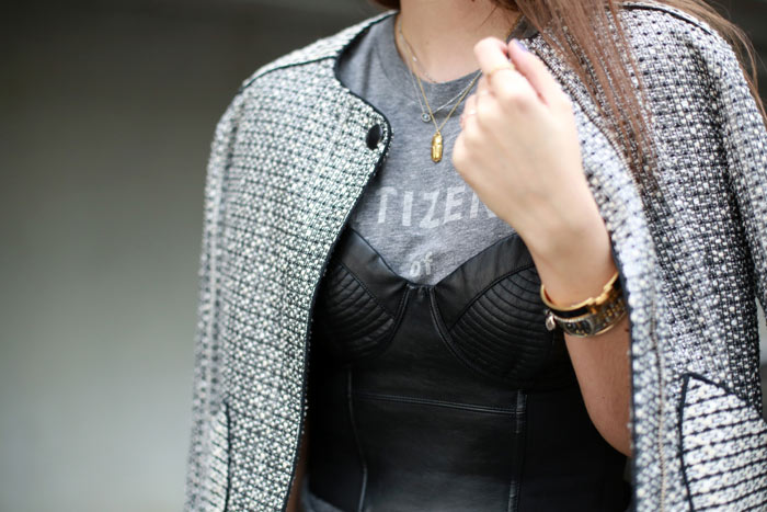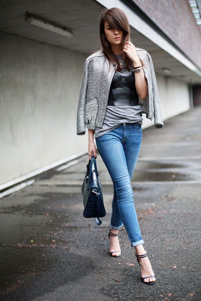 Jacket: Sandro | Jeans: DL1961 | Shoes: Rolando Santana | T-Shirt: Citizens of Humanity | Corset: H&M Trend (old) | Bag: Neri Karra | Beetle necklace: Rachel Entwistle via Boticca