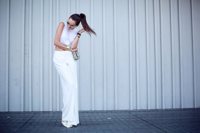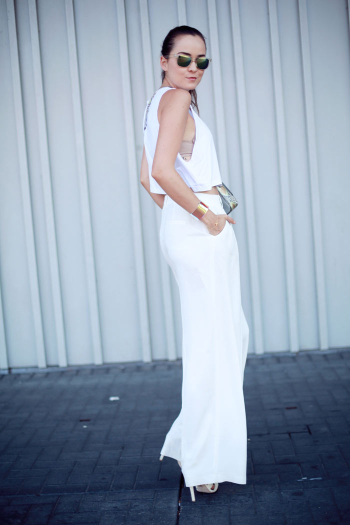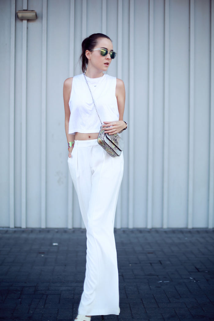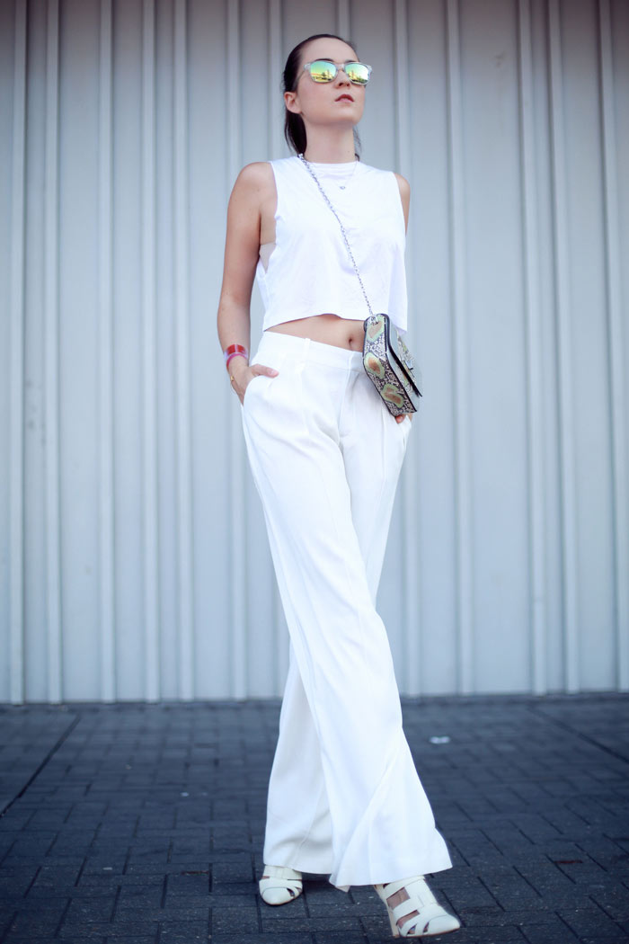 So pretty in all white! I always the combination of a large pants with a crop top!