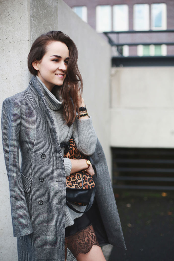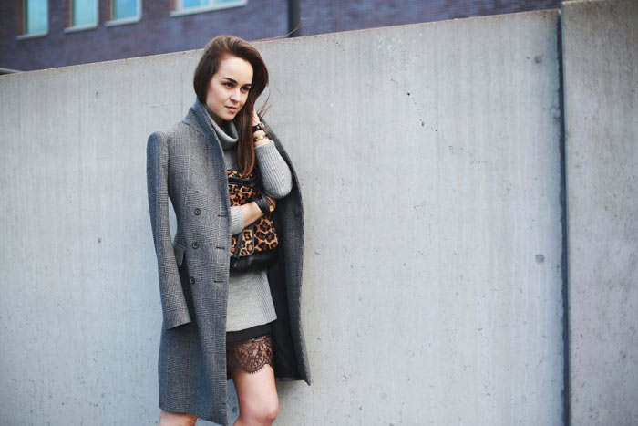 Stunning look – I really love the combination of colors, prints, textures, and fabrics. The chic greys paired with the bold leopard print looks great, especially with the dramatic black lace peeking out. Perfect styling! <3