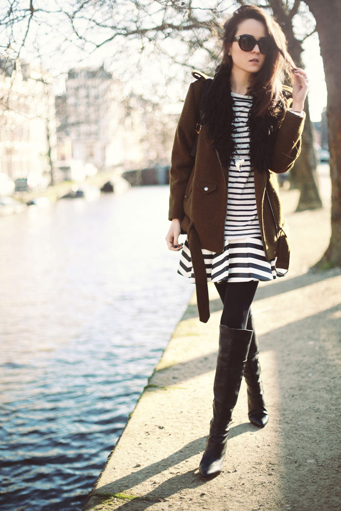 4. Wow, LOVE everyting about this outfit. From the unusual color of the jacket, the combination of the two different striped items to the super sexy boots. Very well combined!