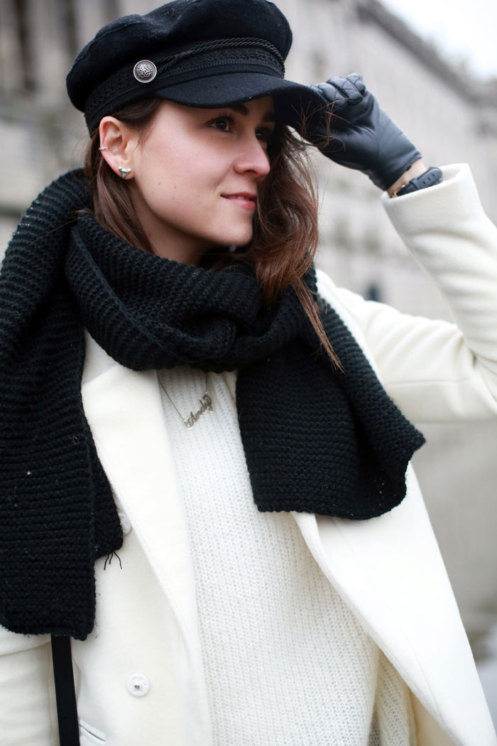 Love the cap and the gloves against the stark white coat!
