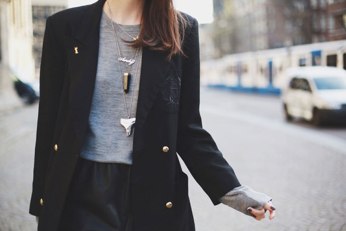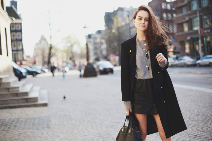 Leather Skirt: Designers Remix | Sandals: Senso | Bag: Givenchy | Coat: Vintage | Sweater: Uniqlo | Rings: Tom Wood | Shark & Quartz necklaces: Fashionology.nl