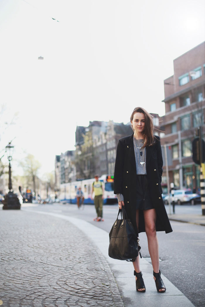 Love so much the long coat, it’s very chic and classic and you can make a lot of differents looks with it. This leather skirt is so cool. Beautiful heels. Amsterdam is amazing!
