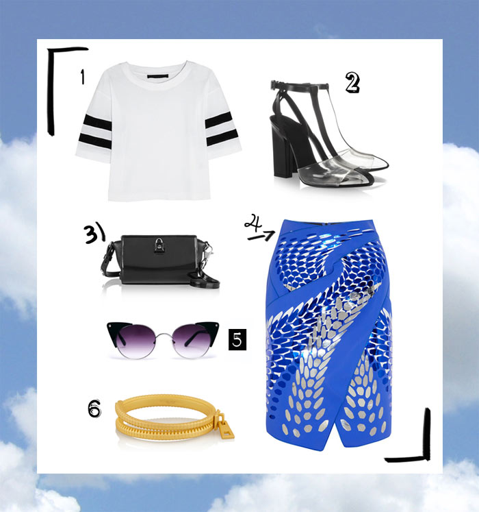 I WISH I WAS WEARING >> 1) Top: Karl Lagerfeld | 2) Sandals: Alexander Wang | 3) Bag: Alexander Wang | 4) Skirt: Dion Lee | 5) Sunglasses: ASOS | 6) Bracelet: Eddie Borgo