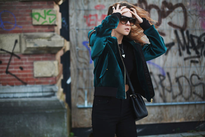 Wow, a velvet bomber jacket is something new! Haven’t seen anything like that for a while. And the deep emerald/turquoise color is magnificent!