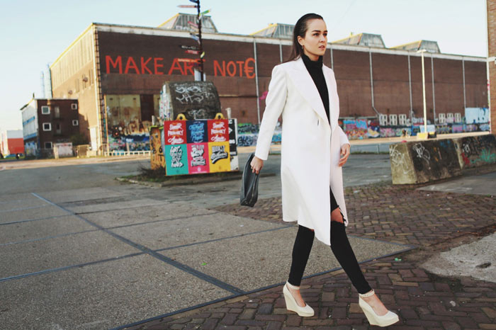 A white coat can really turn a casual look into something a lot more elegant. I love this Sportmax coat with large lapels, it just gives a coat more character, specially when you can raise it up like on the first photo… I would have probably worn this coat on its own, like a “dress” and with that thick black belt over, maybe with a cool pair of ankle boots and a messy hair bun but gosh, it was way too cold for those styling ideas of mine.