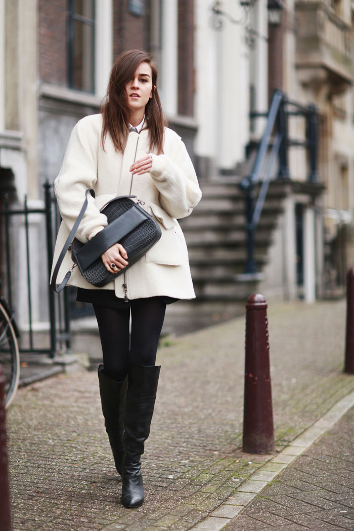 I’M WEARING >> Coat: H&M Studio | Skirt: ZARA | Jumper: Baum Und Pferdgarten | Bag: Sportmax | Boots: Coach | Rings: Tom Wood