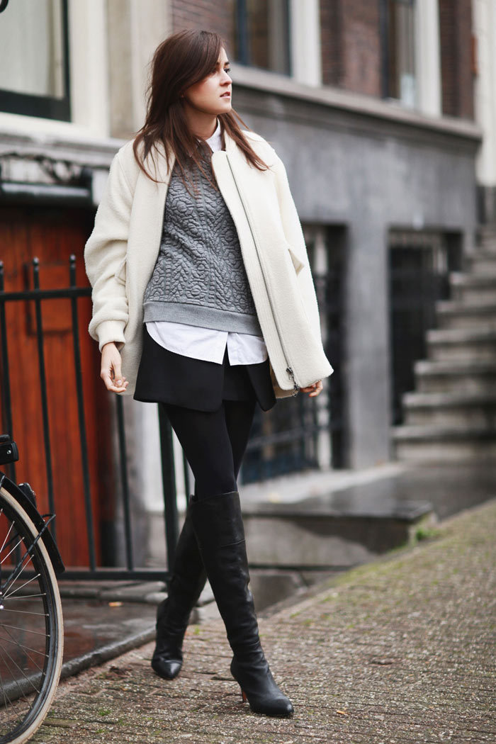 The coat is so adorable, I like it so much with the rest of the look. The grey sweater with this cute skirt is just perfecta and these high boots are really cool and sexy. The bag is pure love, súper chic