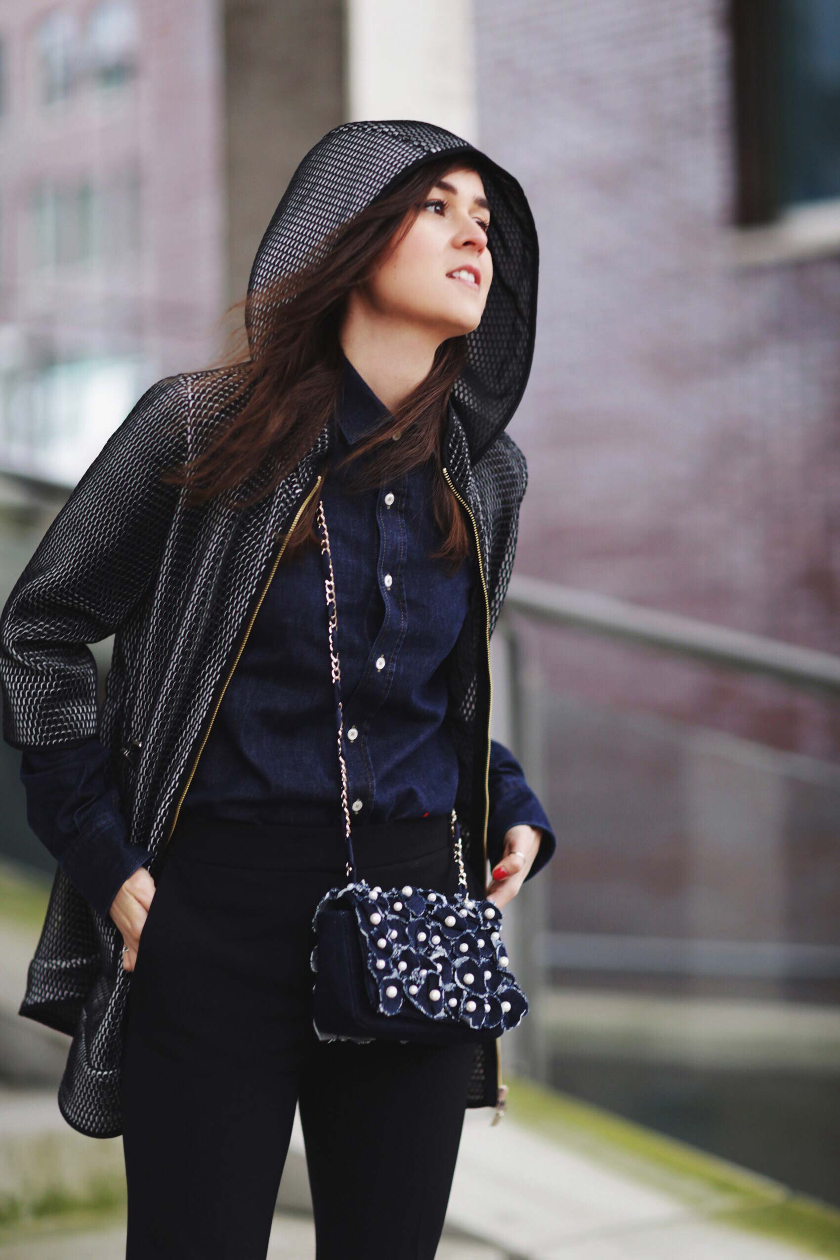Love the pants style, it’s so classic and elegance, it’s just perfect. The mix with the blue shirt is very interesting, contrast between formal and casual. The coat is an unique piece, the material is really origina and it puts the surprise element on this outfit. The Purificacion Garcia bag is pure love, it’s so cute with the flower details and the size, tres chic